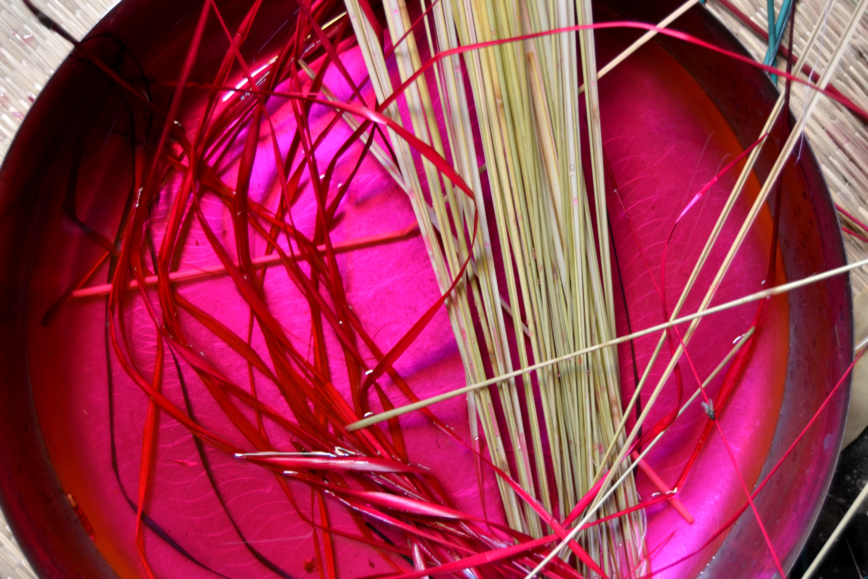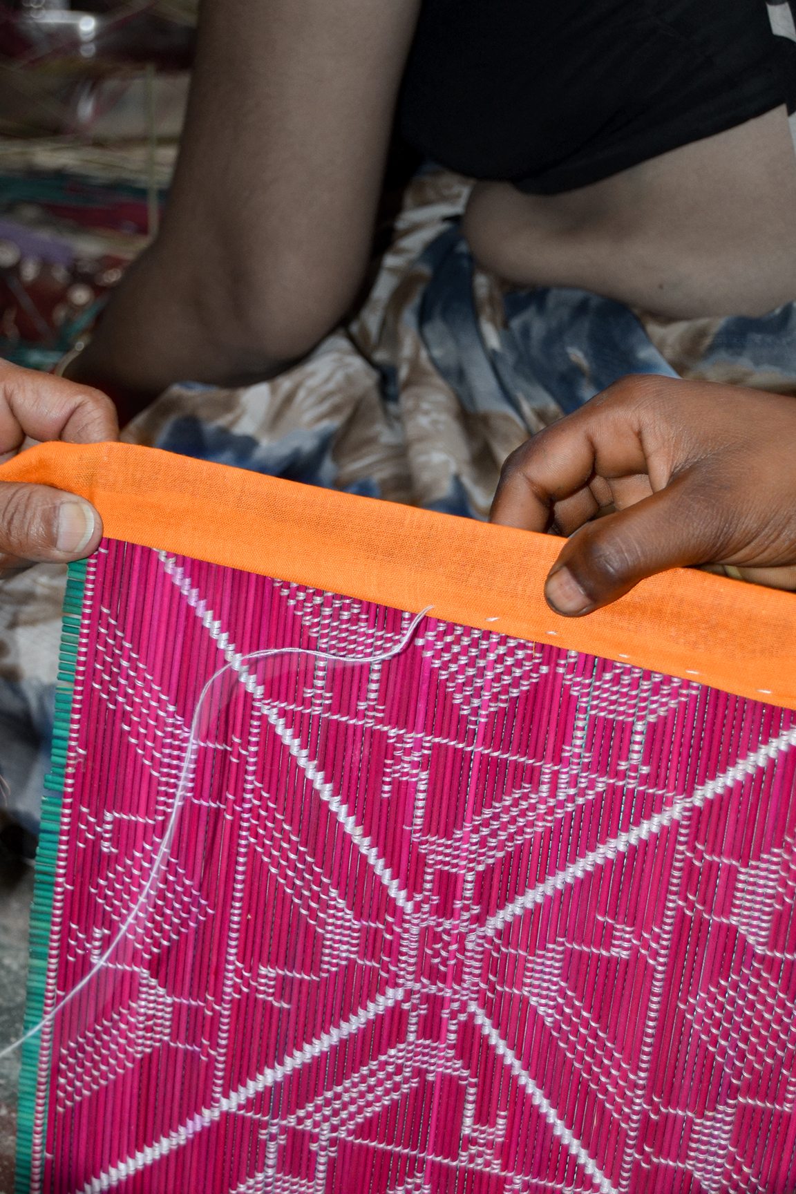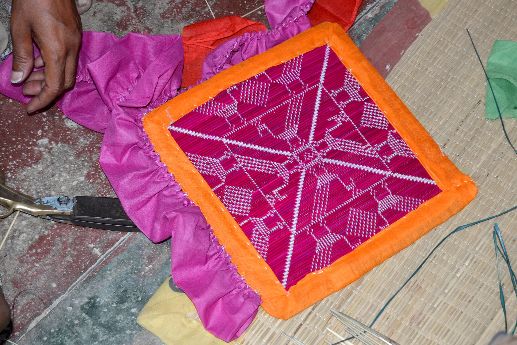 Moonja is boiled in different colors and left to dry in the sun for a few days before it is used to construct a fan. Once, the pattern and color combination of the pankha is decided, women start to weave the design - each one being unique, imaginative and exquisite. These patterns follow grid/ geometry, requiring immense mental calculation and precision. Popular motifs include birds, animals, flowers and geometrical shapes. Once the base of the pankha, usually a square or a circle, is ready with the pattern, a contrasting or matching cloth is sewn on all the edges so that the straw/ moonja gets a well finished periphery. This is then decorated with tassles and small flowers made out of waste cloth that these women find in their neighborhood. Lastly, the handle of the fan, made from a split bamboo stick is attached, making it a revolving hand-held pankha. It takes two to three days to complete a fan.