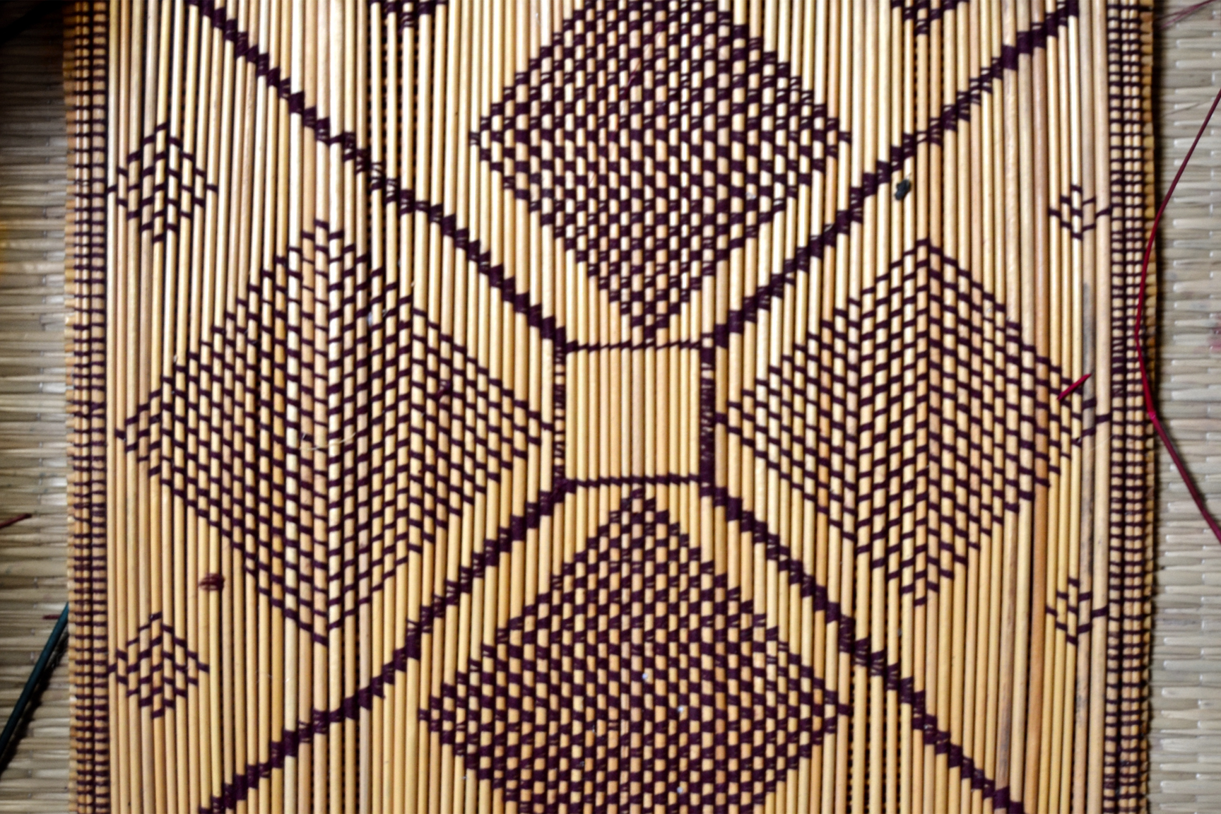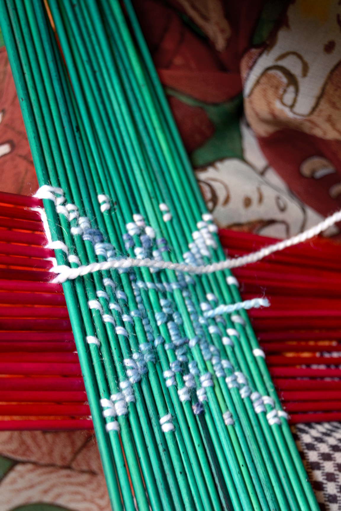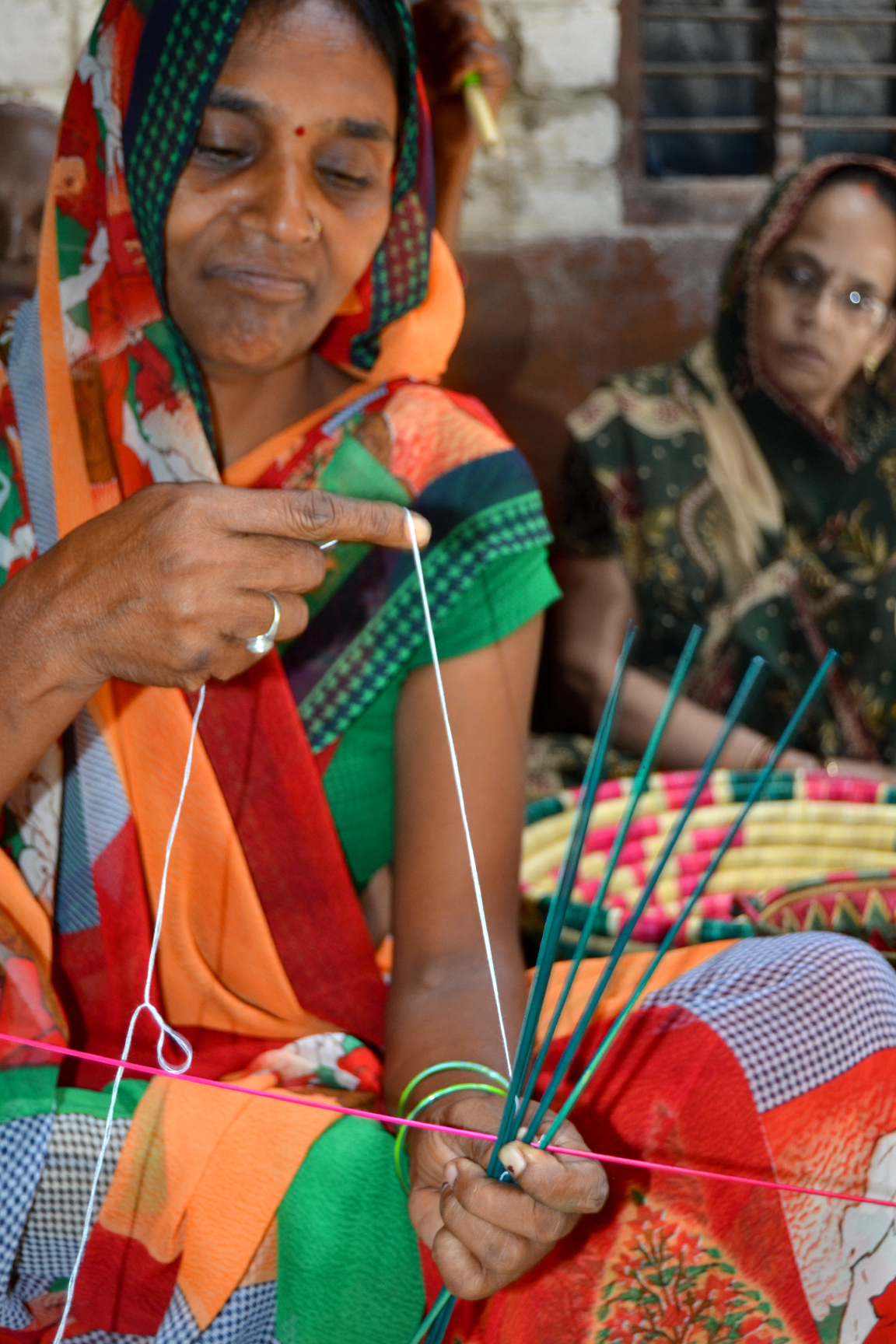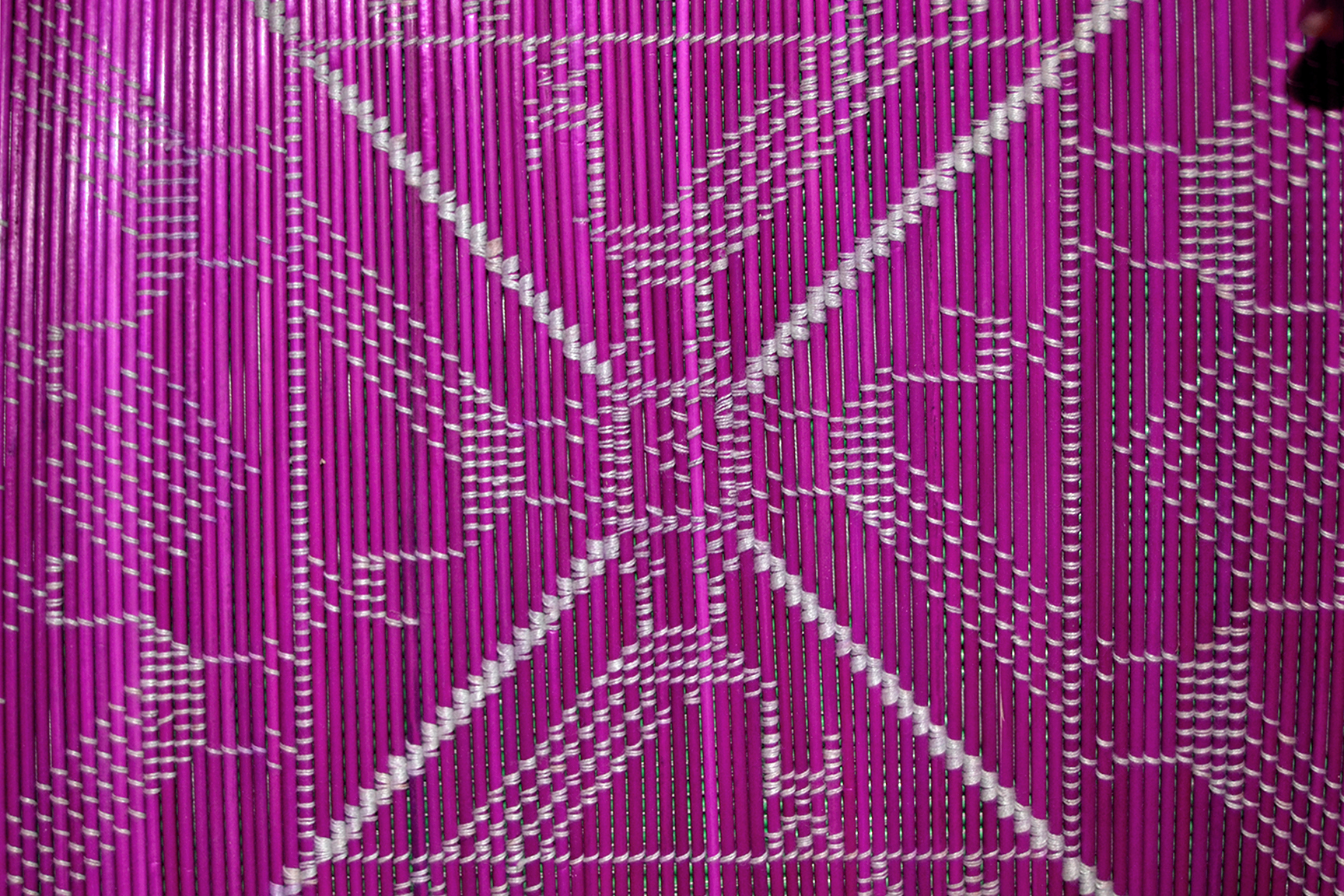 Moonja is boiled in different colors and left to dry in the sun for a few days before it is used to construct a fan. Once, the pattern and color combination of the pankha is decided, women start to weave the design - each one being unique, imaginative and exquisite. These patterns follow grid/ geometry, requiring immense mental calculation and precision. Popular motifs include birds, animals, flowers and geometrical shapes. Once the base of the pankha, usually a square or a circle, is ready with the pattern, a contrasting or matching cloth is sewn on all the edges so that the straw/ moonja gets a well finished periphery. This is then decorated with tassles and small flowers made out of waste cloth that these women find in their neighborhood. Lastly, the handle of the fan, made from a split bamboo stick is attached, making it a revolving hand-held pankha. It takes two to three days to complete a fan.