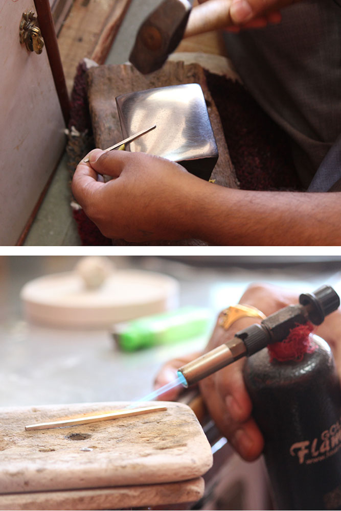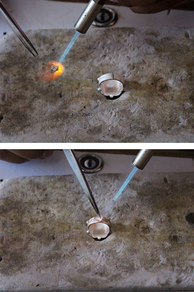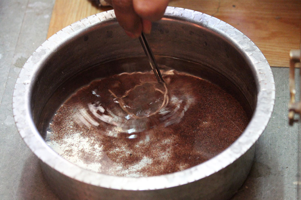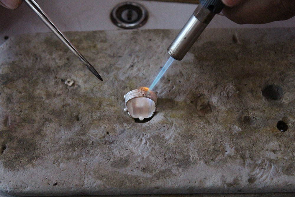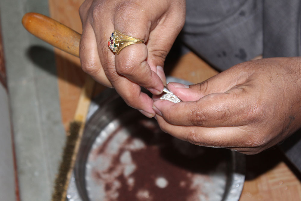 The silver bar is leveled and heated to give the shape of the ring. Then the silver bar is bent to a ring shape using ring sizer and hammer. Soluble flux is mixed with water to make a solution and the knotted silver wire is soldered on the silver ring. A design that has to be fixed on the top of the silver ring is made separately using silver. This motif is further heated. The two ends of the ring are soldered to attach and on the joining of the ring is where the motif is attached by soldering it again. Thus the ring is dipped in water to cool the temperature of the ring. It is further cleaned by scrubbing using metal wire brush. Ring is then scrubbed in the mixture of sand and water. Using a sharp pointed tool, mud that is stuck in-between the design of the ring is cleaned. Thus the pavithra ring is ready to be worn.