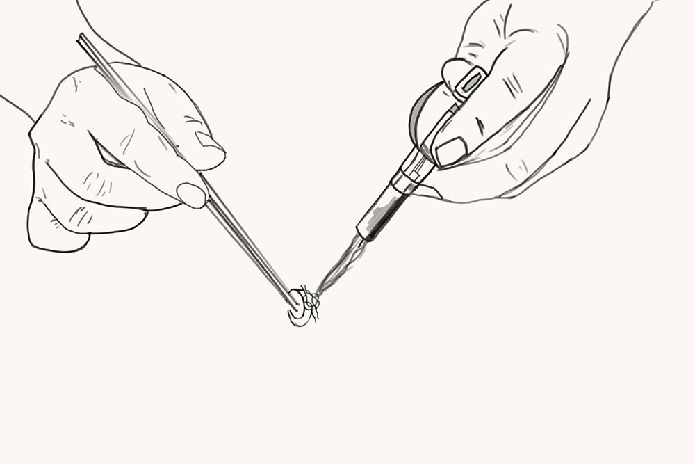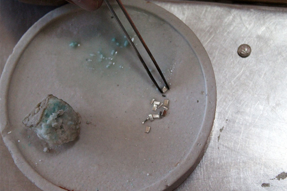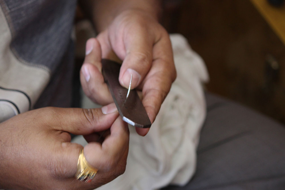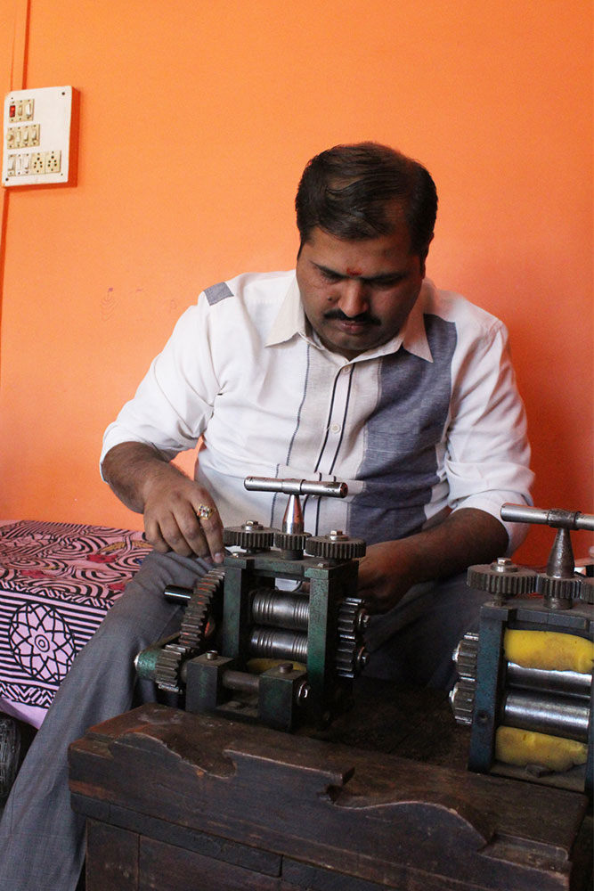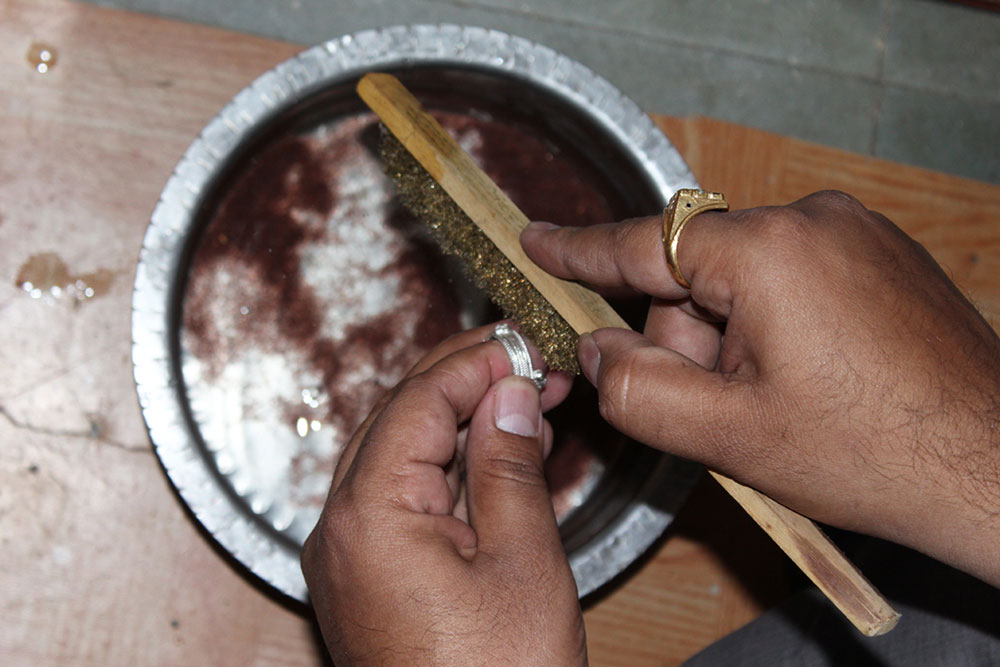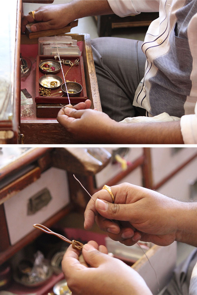 The silver bar is leveled and heated to give the shape of the ring. Then the silver bar is bent to a ring shape using ring sizer and hammer. Soluble flux is mixed with water to make a solution and the knotted silver wire is soldered on the silver ring. A design that has to be fixed on the top of the silver ring is made separately using silver. This motif is further heated. The two ends of the ring are soldered to attach and on the joining of the ring is where the motif is attached by soldering it again. Thus the ring is dipped in water to cool the temperature of the ring. It is further cleaned by scrubbing using metal wire brush. Ring is then scrubbed in the mixture of sand and water. Using a sharp pointed tool, mud that is stuck in-between the design of the ring is cleaned. Thus the pavithra ring is ready to be worn.