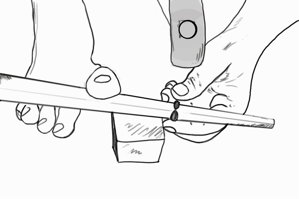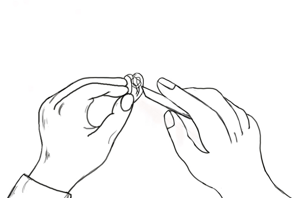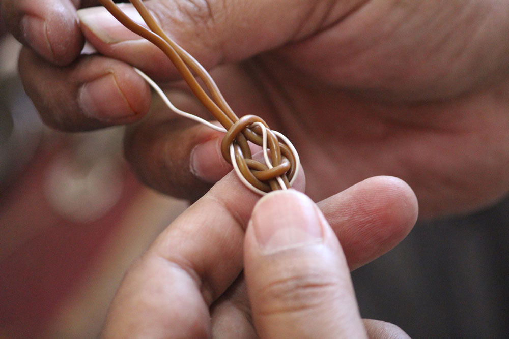 The tools that are used for making pavithra ring are cleaned initially. The surface of the silver bar is hammered thoroughly to make the surface even. The rod is heated for the further process. By using metal rolling machine the heated silver rod is made into thin silver wire. Thus the silver wire is heated and trimmed to the required size. Here the thickness of the silver wire is maintained even. The size of the silver wire is cross checked using gauge tool and the excess of wire is cut off. The ends of the silver wires are joined by twisting them together. Again the wound silver wires are heated. Plastic wire is used for the reference. Silver wire is passed through the plastic wire to obtain the accurate design of the ring. Once the design is obtained then the plastic wire (reference) is removed carefully. Thus the design of the silver wire forms a knot.