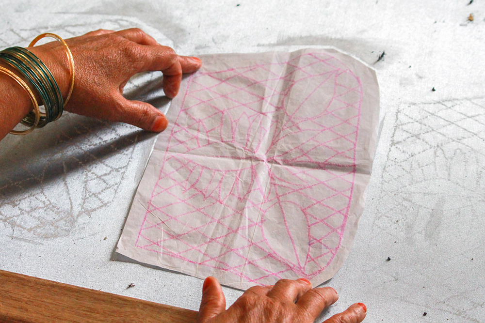 2. Tracing the design onto a piece of fabric is done by placing the patterned butter paper on a flat table with the fabric underneath. Kerosene and color solution is mixed together and this solution is then dipped with a wadded cloth, which is then rubbed over the tracing sheet. This allows the ink from the sheet and the design to get discovered over the fabric.