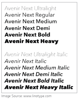 All the variations of a particular typeface or font such as different weights, widths and italics make up a type family. These variations come in handy when a uniform look is needed but the hierarchy is to be maintained.
